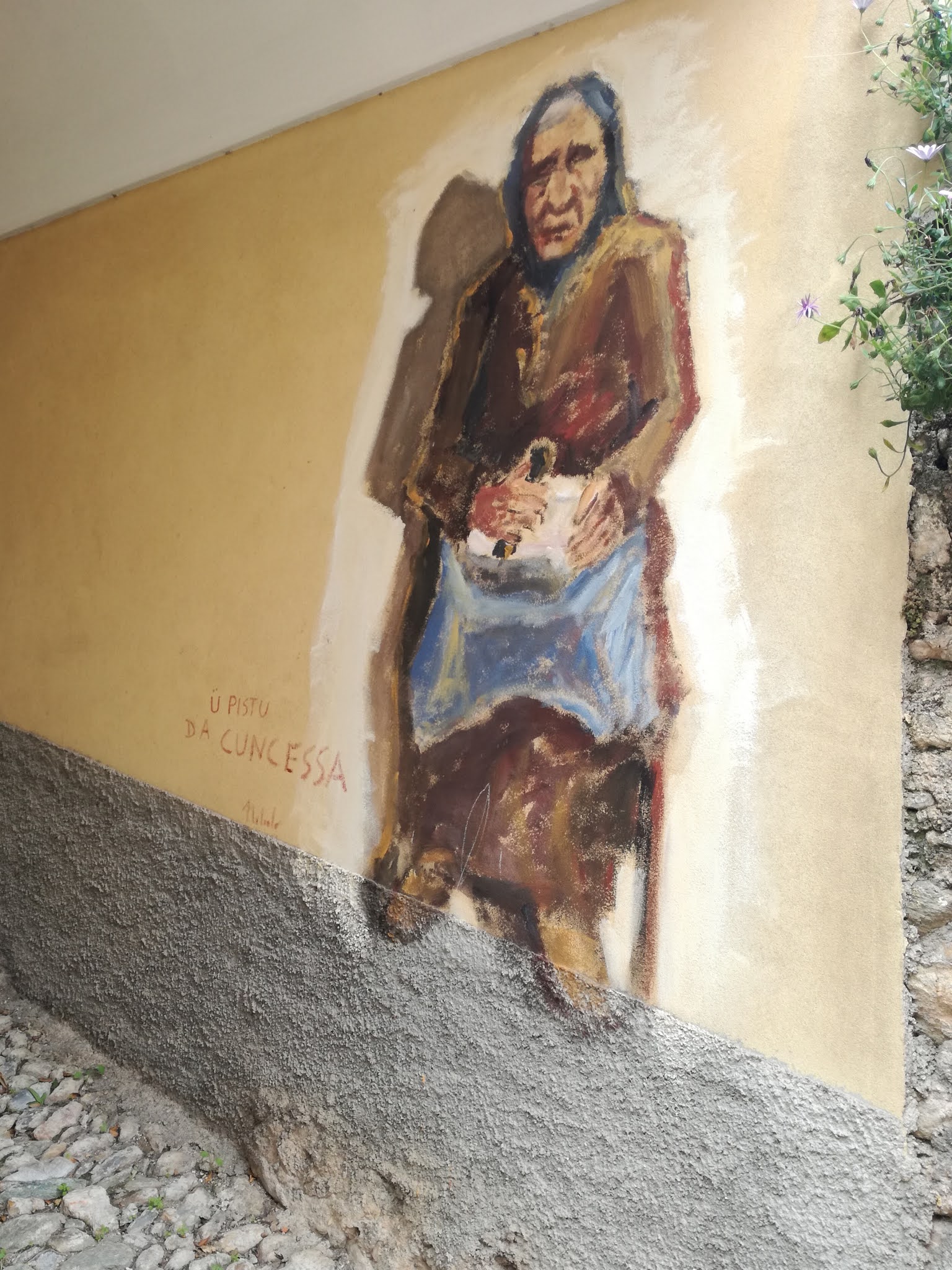 Per valorizzare la storia locale, sulle pareti di Borgio ci sono dei murales che rappresentano o antichi mestieri o personaggi del paese proprio dove si poteva incontrarli un tempo. In questo angolo per esempio si trovava spesso una vecchina che faceva il pesto.